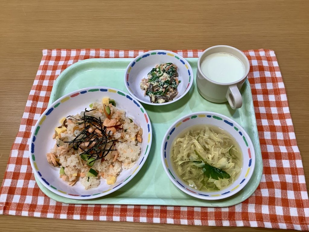 焼きサーモンのちらし寿司と白和え・かきたま汁と飲むヨーグルトです♪